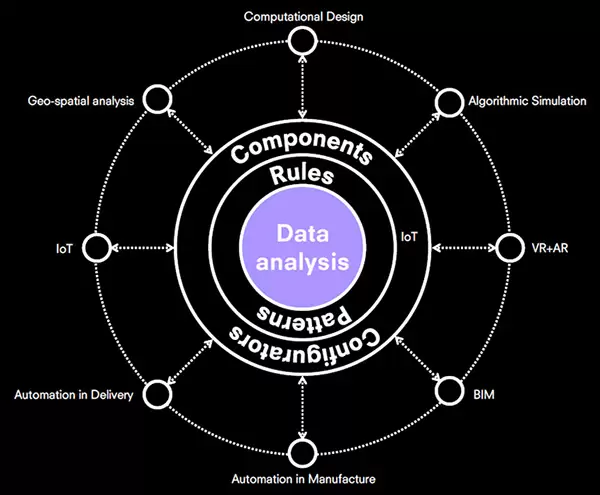 چند جنبه اساسی در رویکرد برایدن وود در مورد راه حل های فناوری وجود دارد که جالب است. مورد اول این است که به دنبال تمرکز بر قوانین و الگوهای مشترک در زمینه فعالیت خود در بخش های مختلف مانند مسکونی ، آموزش ، مراقبت های بهداشتی و زیرساخت ها است تا بر تفاوت بین آنها تمرکز کند. این قوانین و الگوها در الگوریتم های محرک اتوماسیون در ابزارهای طراحی آن ثبت شده است – این چیزی است که آنها را “هوشمند” می کند. مورد دوم این است که داده ها را به جای BIM در مرکز فناوری AEC می بیند (شکل ۱ را ببینید) ، BIM اکنون یکی از “نمای” داده ها است ، مانند AR+VR و IoT.