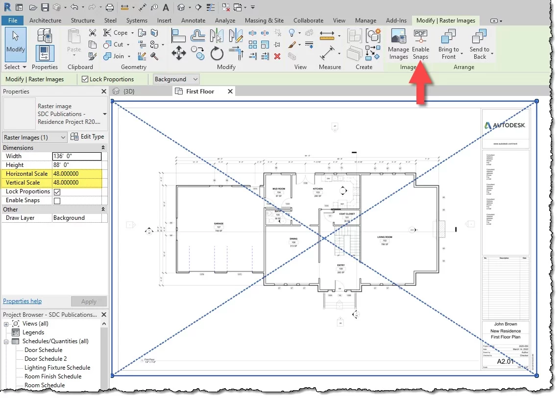 هنگامی که شما فایل PDF وارد شده را انتخاب کنید، می توانید مقدار مقیاس افقی و عمودی آن را از طریق پنجره Properties تغییر دهید. یکی از ویژگی های مهم برای این پشتیبانی جدید فایل های PDF، گزینه ای با نام Enable Snaps می باشد. با فعال کردن این گزینه، نرم افزار Revit به کاربران این اجازه را می دهد تا مانند ترسیمات خط، بر روی فایل PDF کار کنند.