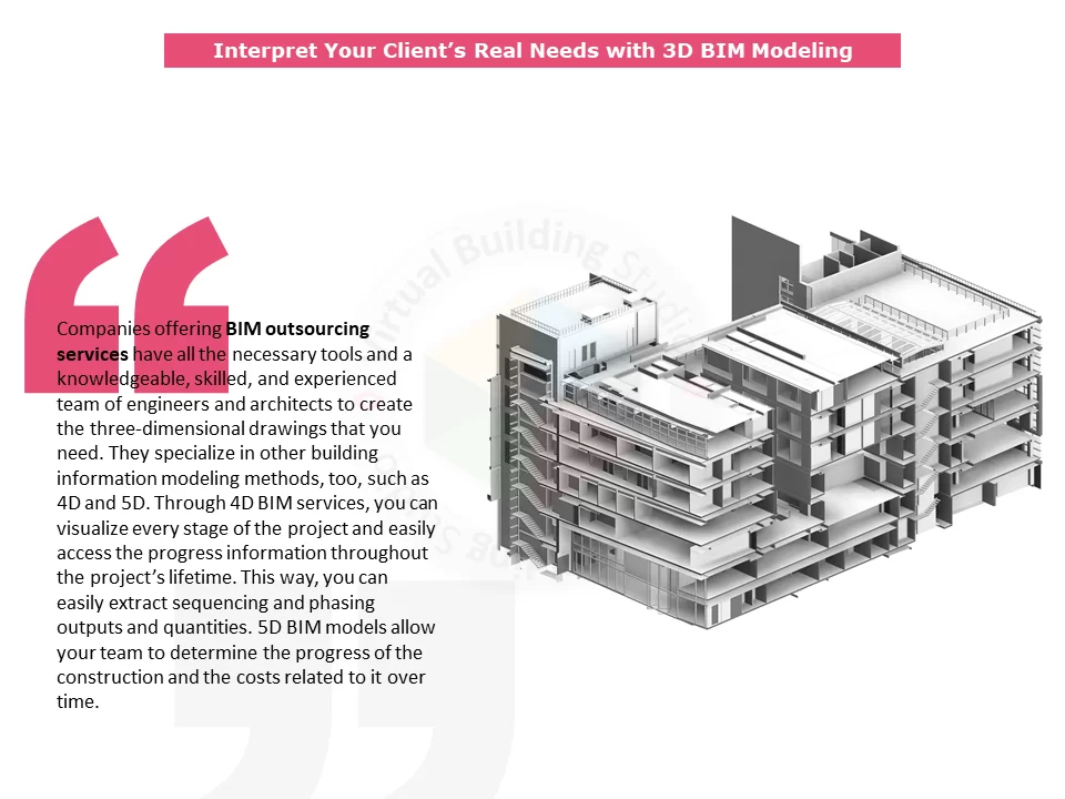 شرکت های ارائه دهنده خدمات برون سپاری BIM مانند IRAN-BIM از تمام ابزارهای لازم و یک تیم آگاه ، ماهر و باتجربه از مهندسان و معماران برای ایجاد نقشه های سه بعدی مورد نیاز شما برخوردار هستند. آنها در سایر روشهای مدل سازی اطلاعات ساخت مانند ۴D و ۵D تخصص دارند. از طریق خدمات ۴D BIM ، می توانید هر مرحله از پروژه را تجسم کنید و به راحتی به اطلاعات پیشرفت پروژه دسترسی پیدا کنید.