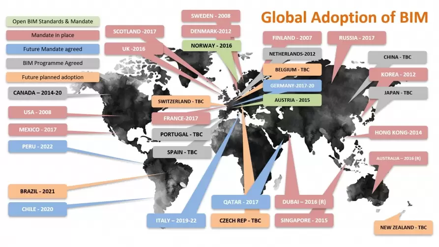 مدل سازی اطلاعات ساخت (BIM) سال هاست که وجود دارد . بنابراین دیگر نمی توان گفت که فرایند جدیدی است. BIM در سطح جهان به تصویب رسیده است . برای آن دسته از کشورهایی که هنوز BIM را تصویب نکرده اند نیز، یک برنامه توافق شده و یک تاریخ برنامه ریزی شده برای تصویب وجود دارد.