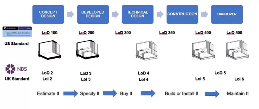 EN ISO 19650-1 جدید سطح اطلاعات را به جای سطح اطلاعات (LoI) و سطح جزئیات (LoD) برجسته می کند ، که می تواند نمونه های خاصی از سطح اطلاعات مورد نیاز باشد.