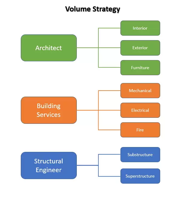 استراتژی حجم رایج ، از پروژه ای به پروژه دیگر متفاوت است. اما اصولاً از اصول خاصی مانند تقسیم به حجم بر اساس رشته های اصلی یا زیرشاخه ها در مورد MEP ، پیمانکاران فرعی استفاده می کند. این تفسیم بندی می تواند ریز تر شود . به عنوان مثال ، توسط بلوک ساختمانی یا زیرسازی و روبنایی یا قاب فولادی و قاب بتونی.