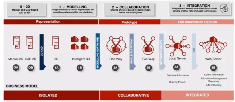 با افزایش تجربه یک سازمان ، سطح بلوغ BIM آن می تواند در برابر الگوی توافق شده بین المللی نگاشت شود. سطح ۱ نشانگر استفاده ساده از مدل سازی سه بعدی است و به عنوان “BIM جداگانه” شناخته می شود. سطح ۲ ، “BIM مشارکتی” ، نیاز دارد که این مدل ها به طور مشارکتی توسعه یافته و به طور موثر به اشتراک گذاشته شوند. سطح ۳ ، “یکپارچه سازی BIM” هنوز در حال تعریف است اما شامل اشتراک گذاری اطلاعات پیچیده تر و گنجاندن رشته های اضافی (به عنوان مثال ژئوتکنیک یا مدیریت تأسیسات) است.