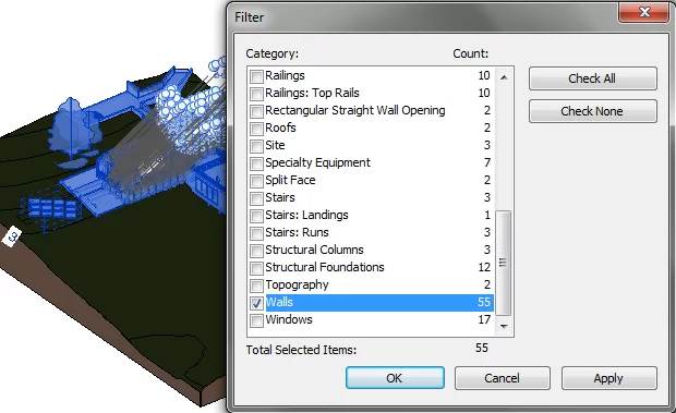 Filter یک گزینه اصلی انتخاب آبجکت است. ابزار فیلتر برای انتخاب آبجکت در یک دسته مفید است. به عنوان مثال ، اگر بخواهید همه دیوارها را در یک نقشه طبقه انتخاب کنید. همه آبجکت یا بخشی از مدل را انتخاب ، سپس روی Filter کلیک کنید.