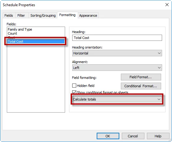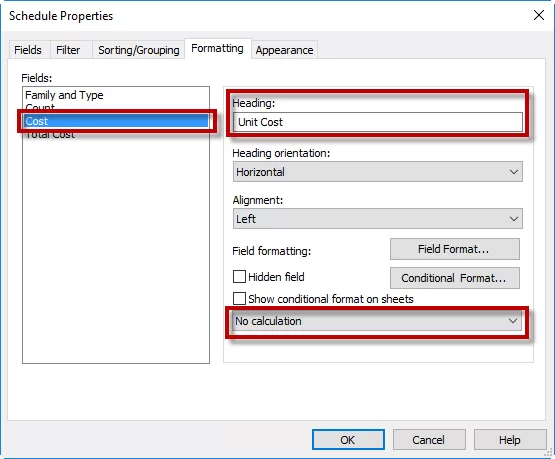 ما دو پارامتر داریم که مقدار هزینه را نشان می دهد. اما ما می خواهیم یکی هزینه واحد را نشان دهد و دیگری هزینه کل را نشان می دهد. می توانیم آن گزینه را در برگه Schedule Properties ، Formatting تغییر دهیم.