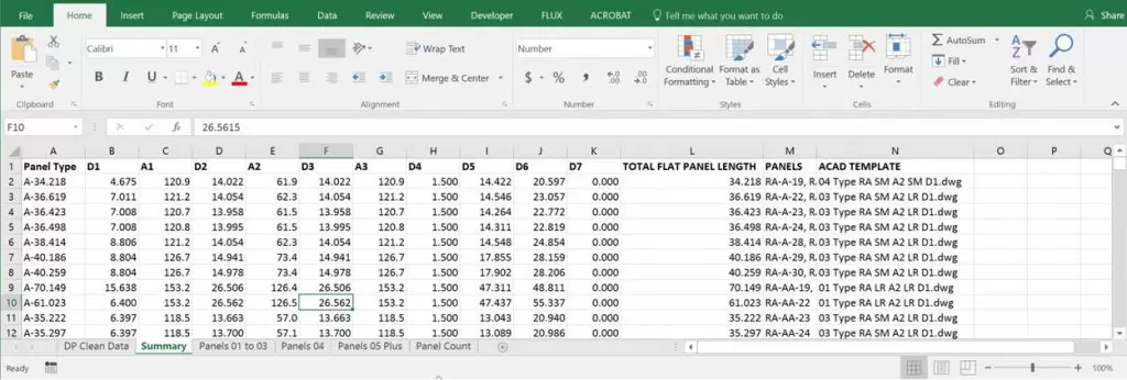 با استفاده از اکسل ، من یک سری ماکرو نوشتم که داده های CATIA را به شکل جدول جدیدی درآورد که ابعاد هر پانل را فهرست می کند. این جدول شامل فرمولهایی است که زوایای هر صفحه را محاسبه می کند.