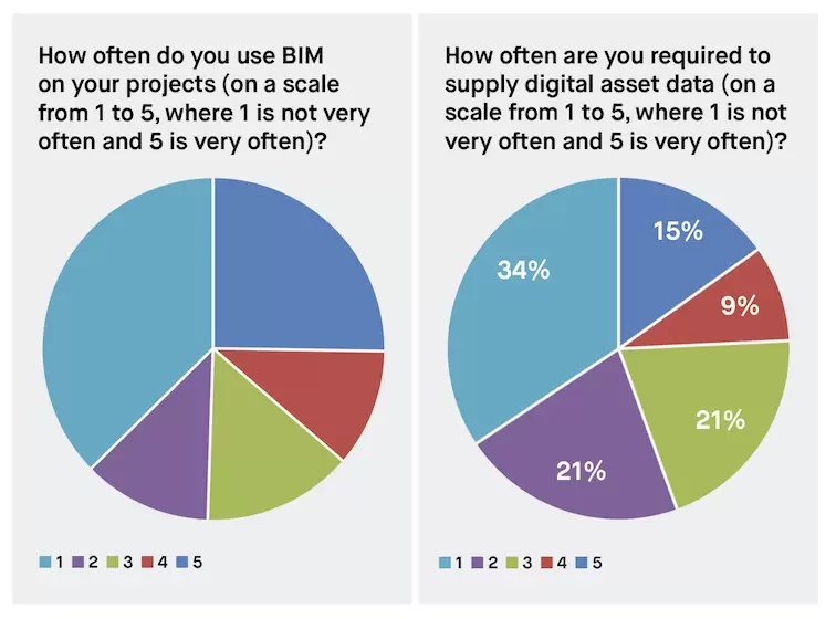 BIM در سال گذشته بیشتر از سال قبل در پروژه ها مورد استفاده قرار گرفته است: بیش از یک سوم پاسخ دهندگان گفتتند که BIM اغلب و تقریباً در پروژه های آنها استفاده می شود ، در حالی که سال قبل ۳۴ درصد بود.