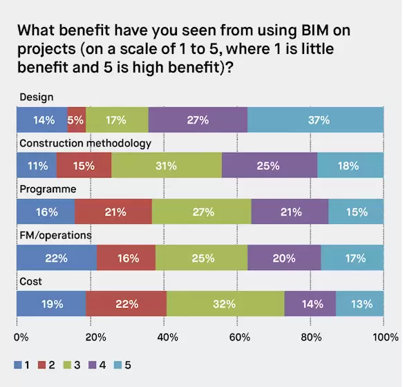 تأثیر مثبت BIM به طور گسترده تری احساس می شود: تقریبا دو سوم (۶۴ درصد) از پاسخ دهندگان گفتند که از نظر طراحی از مزایای زیاد یا نسبتاً بالایی برخوردار هستند در حالی که در نظرسنجی سال گذشته ۵۸ درصد بود.