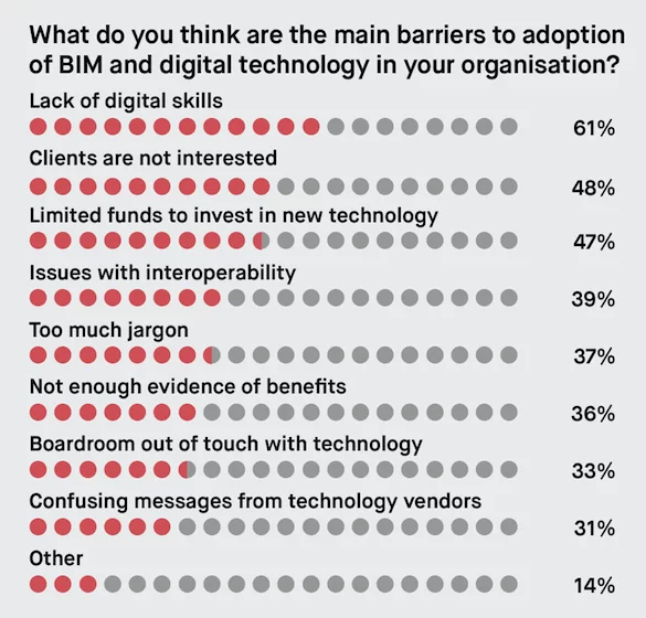 به ندرت فقدان شواهد در مورد مزایا، به عنوان مانعی برای تصویب BIM و فناوری دیجیتال ذکر می شود: درصد پاسخ دهندگان به دلیل عدم وجود شواهد به عنوان مانع ، در نظرسنجی سال گذشته از ۴۵ درصد به ۳۶ درصد کاهش یافته است.