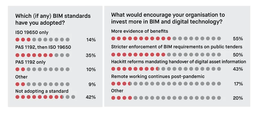 - درصدی که هنوز از مجموعه PAS 1192 استفاده می کند کمی از ۱۲٪ به ۱۰٪ کاهش یافته است ، در حالی که کسانی که از PAS 1192 به ISO 19650 منتقل شده اند از ۲۸٪ به ۳۵٪ افزایش یافته است.
