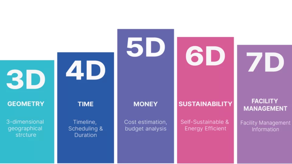 ۶D و ۷D جنبه هایی را مانند پایداری و مدیریت و نگهداشت ساخته ها و مفاهیم دیگری مانند اینترنت اشیا (IoT) شامل می شوند.