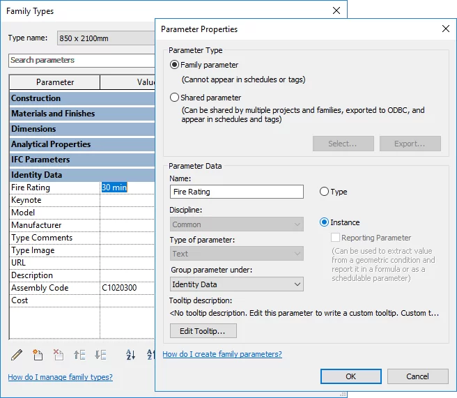فمیلی Door را در نظر بگیرید اگر قصد دارید از گروه Identity Date ، پارامتر Fire Rating را بر روی Instance قرار دهید تا در موقعیت های مختلف یک تیپ درب که Fire Rating متفاوت دارند، مجبور به Duplicate نباشید.