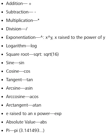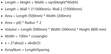 نرم افزار Revit انواع فرمول های عملیات محاسباتی زیر را پشتیبانی می کند. جمع (addition)، تفریق (subtraction)، ضرب(multiplication)، تقسیم(division)، توان(exponentiation)، لگاریتم (logarithms) و جذر ریشه ها (square roots). همچنین فرمول ها توابع مثلثانی مانند ، sine، cosine،tangent، arcsine، arccosine و arctangent را پشتیبانی می کند.اینها فرمول های پایه ای ریاضی هستند که پیچیده گی خاصی ندارند و می توانند برای کنترل و قدرتمند کردن آنها استفاده شوند.