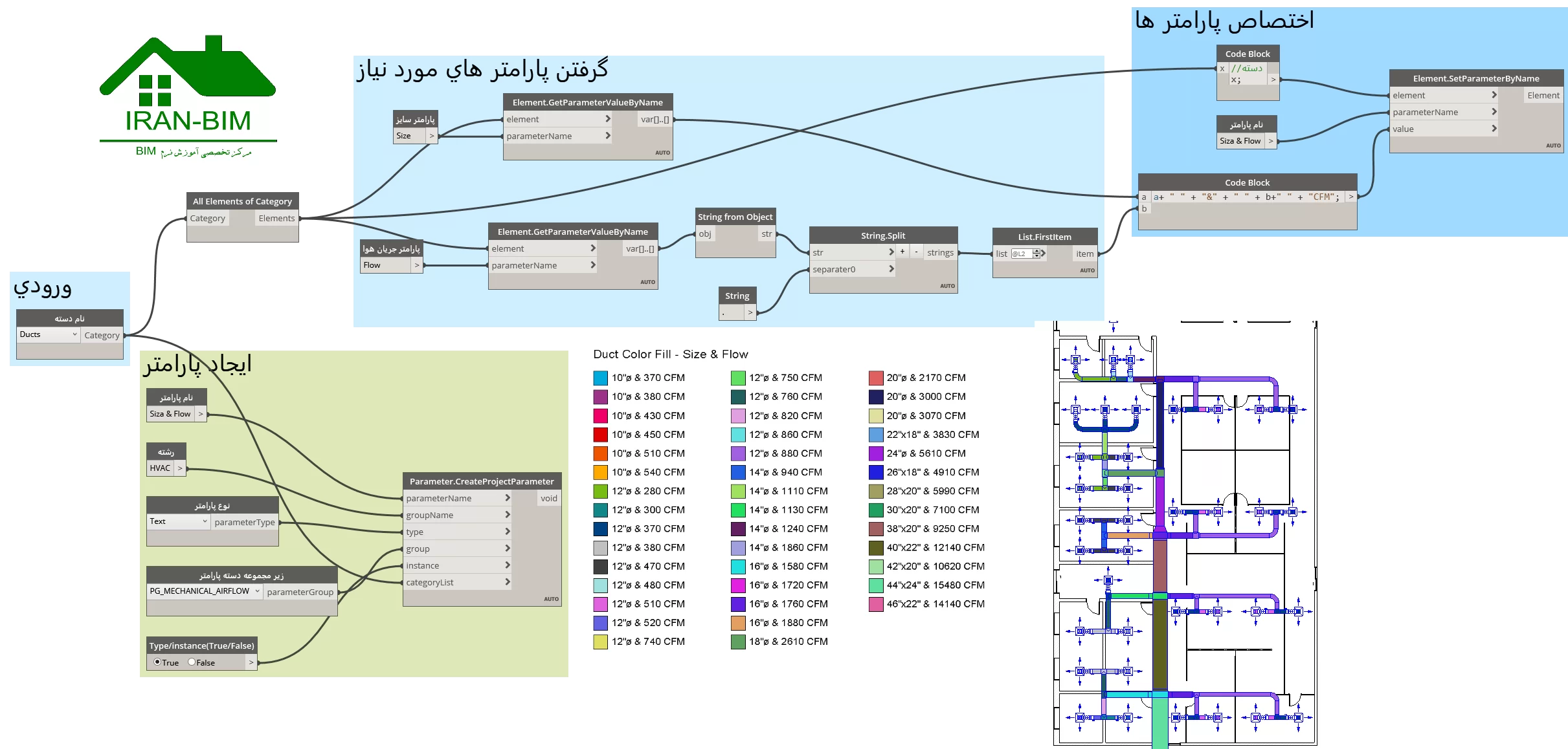 گاهی در برخی پروژه ها برای مثال MEP نیاز است کارهایی انجام دهید که نرم افزار Revit به صورت پیش فرض امکان آن را ندارد و یا اینکه بسیار طولانی و دستی است که این حالت های دستی باعث افزایش خطا می شود. اما برنامه قدرتمند داینامو ما با جرعت و اعتماد به نفس بالایی می توانیم همه این مشکلات را حل کنیم. برای مثال اگر شما قصد داشته باشید که در Duct Legend پروژه های HVAC هم سایز کانال ها و هم Flow را داشته باشید و یا در Room Legend معماری شماره اتاق و نام اتاق را داشته باشید می توانید از این اموزش استفاده کنید. در این آموزش یادخواهید گرفت که چگونه با کمک داینامو پارامتر های مورد نیاز را بسازید، پارامترهایی را از عناصر موجود در مُدل پروژه بگیرید و سپس مقادیر جدید را به پارامتر ساخته شده اختصاص دهید.