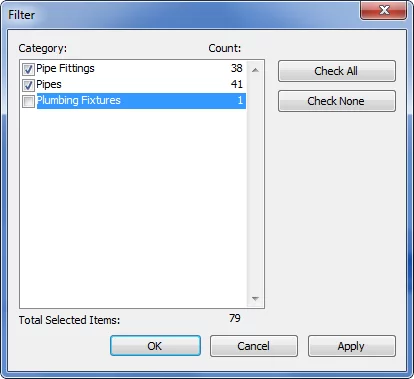 در کادر Filter ، علامت گزینه Plumbing Fixtures را بردارید. Pipe Fittings و Pipes تیک داشته باشند.