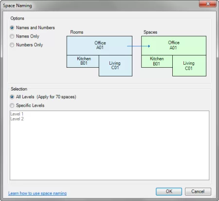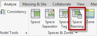 می توانید از ابزار Space Naming استفاده کنید. این ابزار از Revit 2017.1 به بالا در دسترس است. با این حال ، اگر از نسخه قدیمی استفاده می کنید ، باید Space Naming Utility را جداگانه نصب کنید .