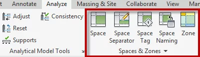 اگر با ایجاد اتاق در Revit Architecture آشنا هستید ، ایجاد Space نیز مشابه است. می توانید ابزارها را در پانل Analyze> Space and Zones پیدا کنید .