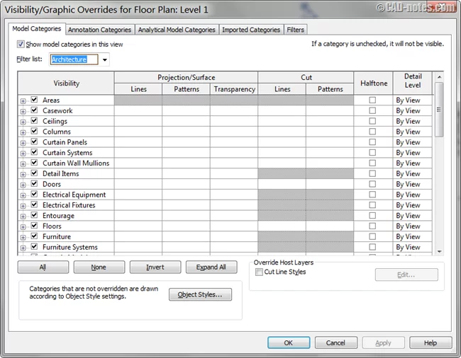 تنظیمات Visibility / Graphic Overrides دقیقاً همان Object Styles است. تنها تفاوت در این تنظیم این است: فقط در یک نما اعمال می شود. با رفتن به برگه دیگر می توانید دسته ها و مدل های حاشیه نویسی را لغو کنید.