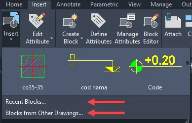 دسترسی از طریق Ribbon برای درج بلاک ها، دو گزینه جدید با نام Recent Blocks و Blocks from other Drawings را برای پروژه جاری در دسترس کاربران قرار داده است.