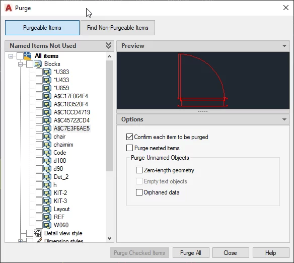 ویژگی Purge برای آسانتر تمیز کردن ترسیم و سازماندهی تجدید نظر و مجدد طراحی شده است. گزینه های options تقریبا مانند نسخه های قبل می باشد، اما بخش Preview برای پیش نمایش آیتم انتخاب شده قابلیت تغییر سایز را دارد.