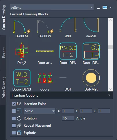 این دو گزینه پنجره بلاک را در زبانه های Recent و یا Other Drawing باز می کند. زبانه Current Drawing نیز بلاک های خود را در گالری Ribbon نمایش می دهد. که می توانید با کلیک و دراگ کردن و یا کلیک و قرار دادن استفاده کنید.