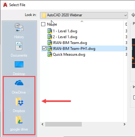 در حا حاضر AutoCAD 2020 از اتصال و ذخیره سازی فایل ها با چند سرویس دهنده خدمات ابری در هنگام Open یا Save و Save As پشتیبانی می کند. با توجه به آن چیزی که نصب و استفاده می کنید در پانل سمت چپ پنجره انتخهاب فایل، لیست می شود. مانند Dropbox، Google Drive ، OneDrive