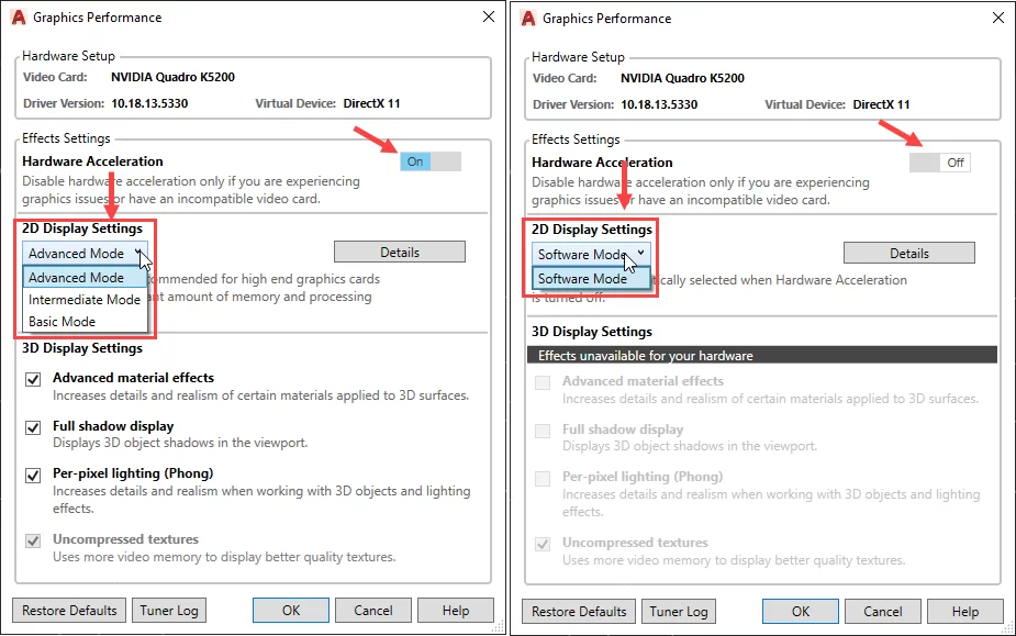 اتوکد ۲۰۲۰ اکنون با درایورهای متفاوتی مانند (Dx9, Dx11, or no driver) و یا مانیتور هایی با وضوح بالا (۴K) و dual monitors به درستی اجرا می شود. علاوه بر این، گزینه های جدیدی به پنجره تنظیمات گرافیک اضافه شده است.
