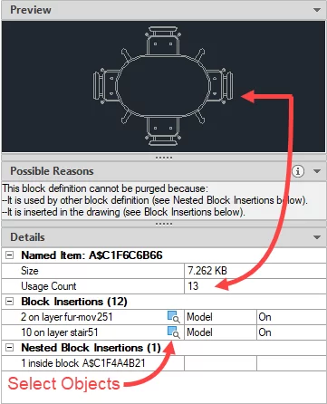 * برای موضوعاتی که نمی تواند پاکسازی شود، یک بخش جدیدی طراحی شده است که در آن تعداد موضوعات در هر لایه و تاثیر آنها بر حجم فایل را نشان می دهد. همچنین دکمه ای با نام Select Objects اضافه شده است که با کلیک بر روی آن، موضوعاتی که امکان پاکسازی را ندارد در صفحه ترسیم بزرگنمایی و انتخاب می کند.
