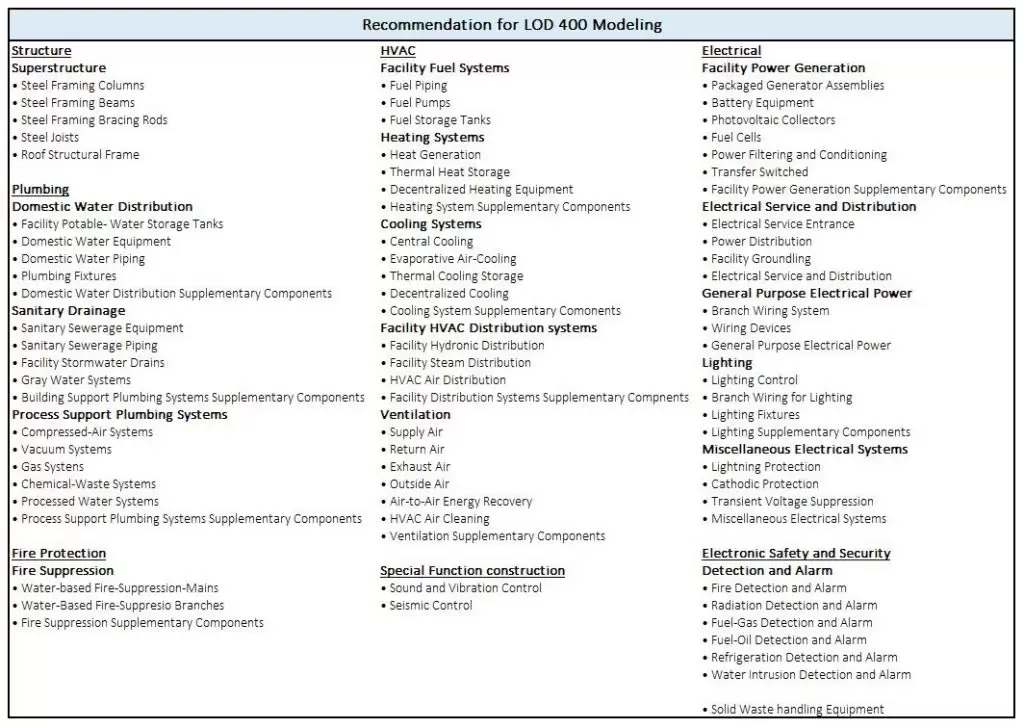 یکی از تصمیمات مهم برای تیم طراحی A / E تولید یک مدل طراحی Revit تا LOD 400 است. آنها برای برآورده کردن برنامه های پروژه و چگونگی کاهش زمان شروع مراحل ساخت و نصب کار می کنند. معاملات برای ساخت و نصب با LOD 400 کار می کنند. برخی از عناصر ساختاری و MEP مدل LOD 400 از درگیری جلوگیری می کند و باعث صرفه جویی در وقت و هزینه کار نصب می شود.