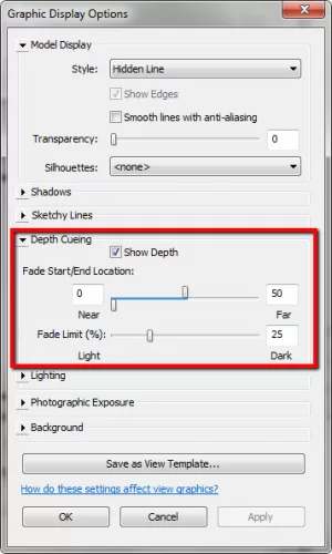 برای دستیابی به گزینه ی Depth Cueing، می توانید آن را در Graphic Display Options پیدا و فعال کنید. روی دکمه Visual Styles در زیر پنجره نما کلیک و آن را از لیست انتخاب کنید.