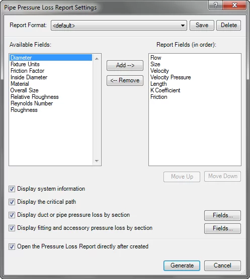 کادر بعدی Pipe Pressure Loss Report Settings است. می توانید قسمت های مورد نظر را برای گزارش انتخاب کنید.
