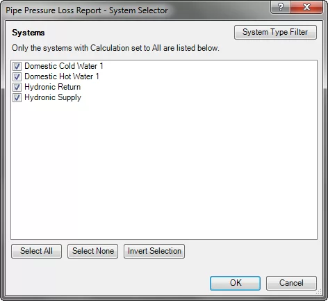 Revit برای انتخاب سیستم تولید گزارش ، کادری را نشان می دهد. سیستم های مورد نظر خود را انتخاب کرده و OK را کلیک کنید.