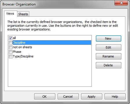در Browser Organization ، دو برگه مشاهده می کنید: Views و Sheets. تنظیمات هر دسته مشابه است.