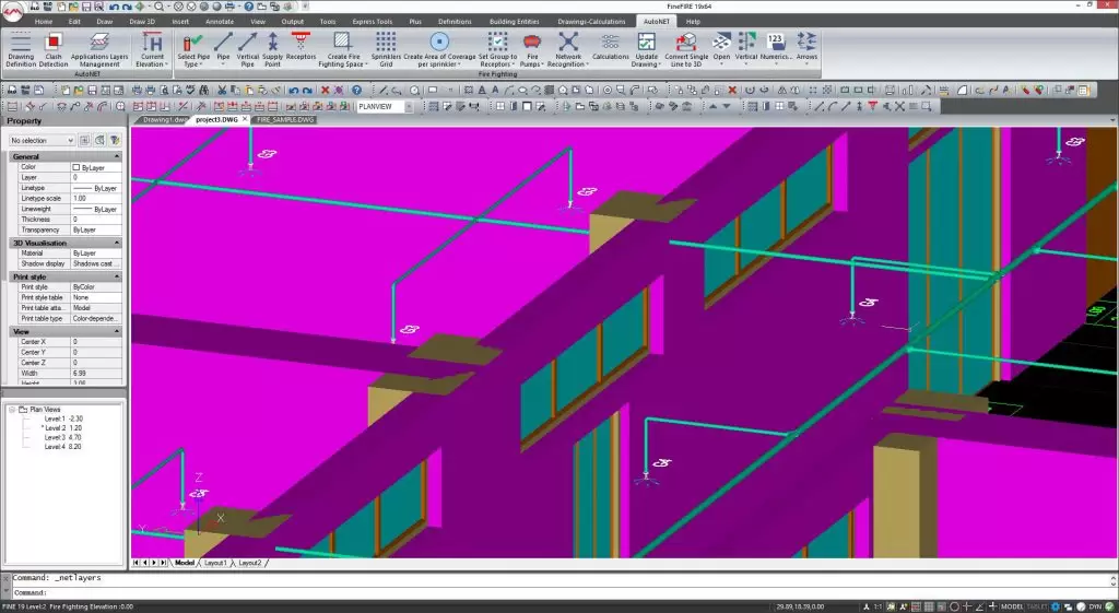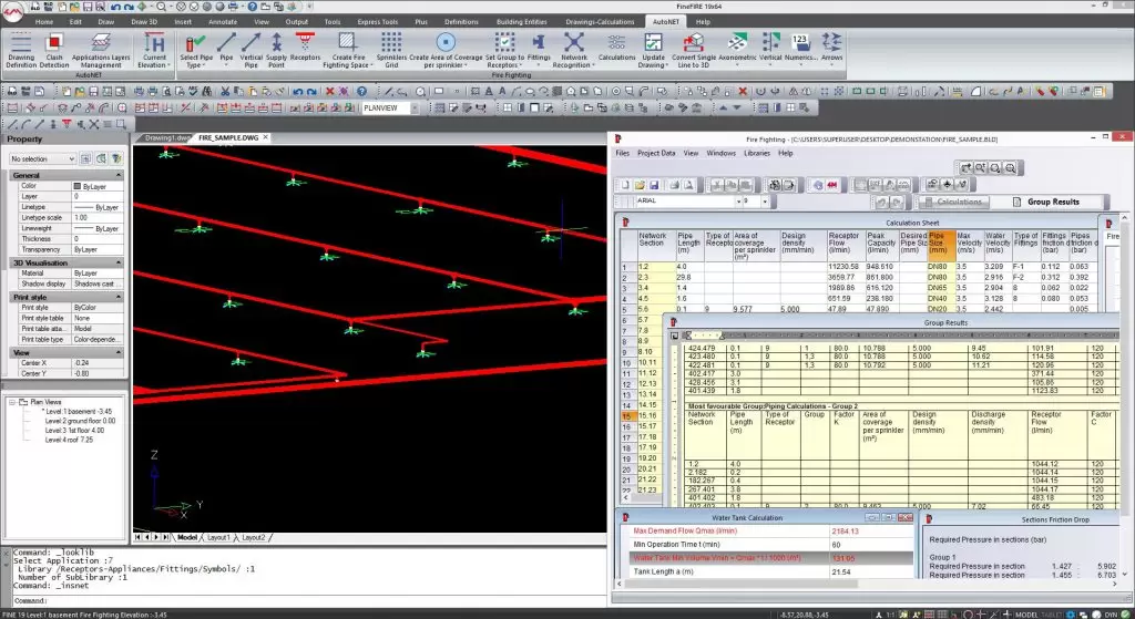 شبکه اطفای حریق با FineFIRE ، طراحی و محاسبه شده است. FineFIRE عملکردی شبیه اتوکد را با رویکرد آشنای BIM ترکیب ، که به کاربر کمک می کند شبکه لوله کشی را سریع و هوشمند ترسیم کند.