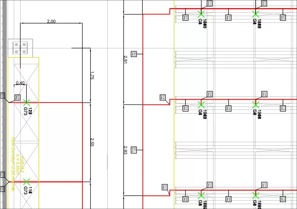 پارامترهایی مانند حداکثر مساحت عملکرد در هر آبپاش (m2) ، چگالی طراحی (mm/min) ، تلفات اصطکاک (bar) ، جریان (لیتر در دقیقه) و موارد دیگر مطابق با استاندارد NFPA 13 همه در برگه محاسبه نشان داده شده است. کاربر به متغیرهای مستقل دسترسی دارد و کل برگه محاسبه پس از هر تغییر به طور خودکار به روز می شود. مهمتر از همه ، طراح می تواند همزمان بر نقشه ها و محاسبات نظارت کامل داشته باشد (شکل ۶).