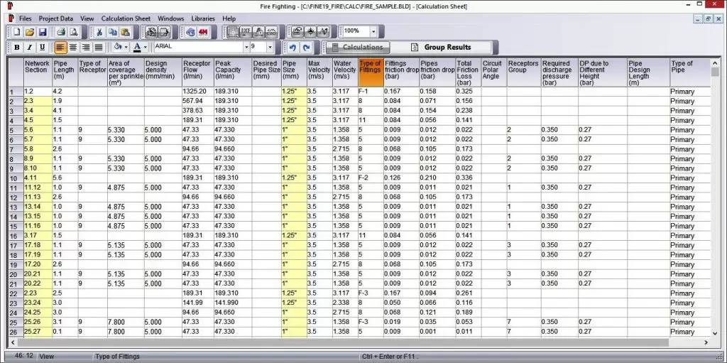 نتایج محاسبه ، همانطور که توسط موتور محاسبه FineFIRE ارائه شده است ، ابعاد دقیق شبکه پروژه را مشخص می کند که در آن اندازه هر لوله مطابق با استانداردها است. شماره ها و بخش های گره شماره گذاری شده و به طور خودکار نامگذاری می شوند تا دید و کنترل آسان در برگه محاسبه برای هر بخش لوله و آبپاش فراهم شود (شکل ۵).