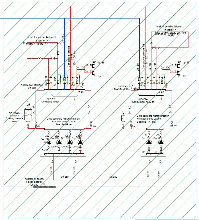 گزارشات محاسبه شامل کلیه نتایج مرحله به مرحله و نهایی مطابق با استاندارد انتخاب شده است. خروجی شامل مجموعه ای از نقشه های دو بعدی و سه بعدی است که پس از محاسبه به طور خودکار تولید و به روز می شوند. نمودار نمادین طرح پمپ ها نیز موجود است (شکل ۸)