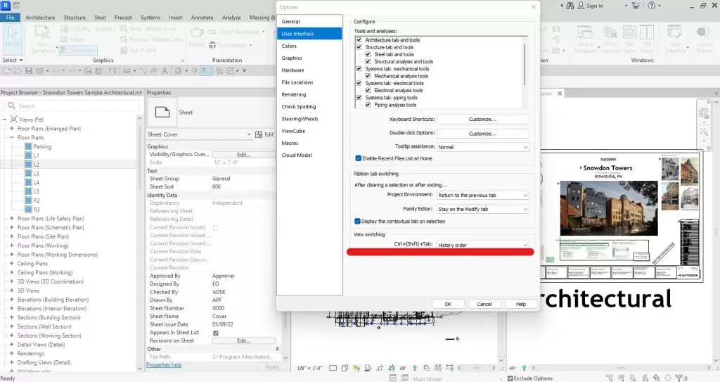 تا قبل از این به روزرسانی، معمولاً با فشار دادن کلیدهای Ctrl + Tab، Revit به صورت ترتیب نماهای باز شده را نمایش میداد، و با فشار دادن Ctrl + Shift + Tab ترتیب را برعکس میکرد. اما این روش ترتیبی از دیدن نماها همیشه کاربردی نبود.
