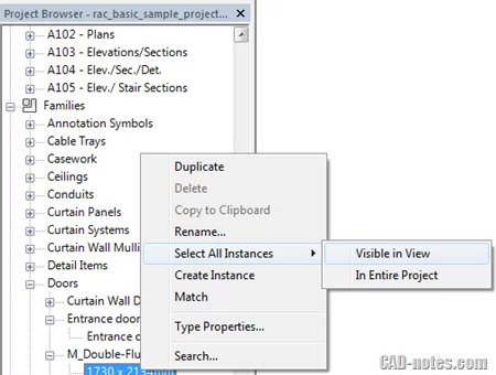 یا این که گروه families را گسترش دهید ، سپس نوعی را که می خواهید انتخاب کنید پیدا کنید. کلیک راست کنید ، سپس از select all instances انتخاب کنید. اگر نوع فمیلی را بشناسید ، اما ندانید کجا قرار گرفته اند ، این روش انتخاب بسیار مفید است.