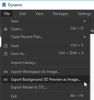 Export 3D Model : در نسخه Dynamo 2.0 می توانید از شکل هندسه ایجاد شده در داینامو خروجی عکس بگیرید. این ویژگی از منوی File > سپس گزینه Export Background 3D Preview as Image قابل دسترسی می باشد.