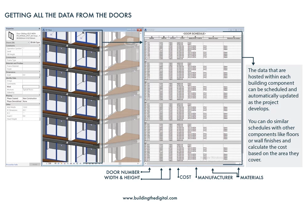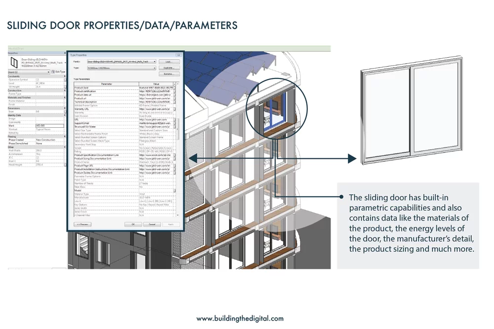 این اصطلاح مربوط به مدل سه بعدی مجازی است. مبتدیان BIM هنگام کار با ابزار BIM به دو مزیت زیر توجه می کنند: اولاً ، قابلیت های پارامتری تمام هندسه ها (یا اشیا)) موجود در مدل. و در مرحله دوم ، داده های میزبانی شده در آن اشیا. اینها به خصوصیات جسم مربوط می شوند و عملکردشان را در طول چرخه حیات ساختمان به کاربر توضیح می دهند. تصویر زیر نمونه ای از تمام داده هایی را که می توانید از یک درب کشویی دوگانه بدست آورید نشان داده است.