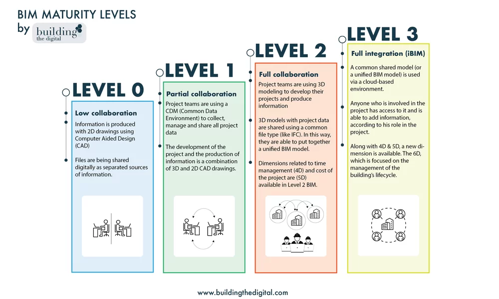 در حال حاضر چهار سطح بلوغ مدل سازی اطلاعات ساخت وجود دارد. آنها با درجات همکاری بین رشته ها و توانایی تبادل اطلاعات به صورت دیجیتال سروکار دارند. سطح BIM سطح جزئیات (LOD) را تعریف می کند که یک مدل BIM در آن توسعه می یابد.