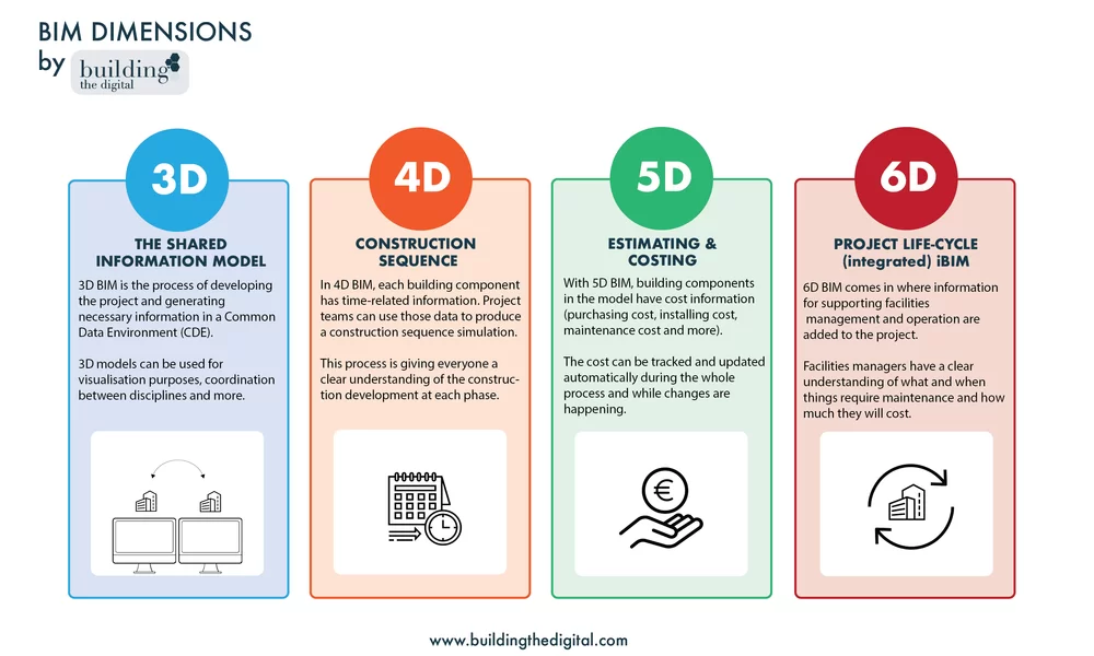 ابعاد BIM، چگونگی توسعه مدل سه بعدی مجازی را در طول چرخه حیات ساختمان تعیین می کند. براساس اطلاعات مدل BIM ، تیم می تواند با دقت بیشتری بازه زمانی ، هزینه و عملکرد ساخت را تعیین کند.