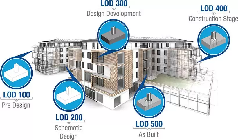 سطح جزئیات(LOD) ویژگی های عناصر مدل سیستم های ساختمانی را مشخص و توضیح می دهد. اینها در صنعت AECO قادر به بیان و تعیین محتوا و قابلیت قابل اطمینان BIM در مراحل مختلف طراحی و ساخت و ساز با دقت بالا هستند. این قضیه کمک می کند تا متخصصان به سوالات زیر پاسخ دهند: