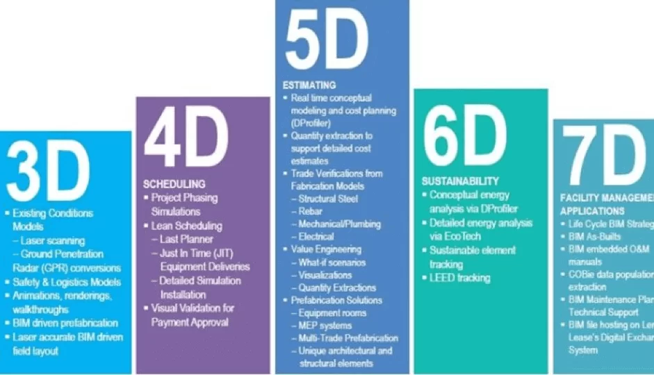 در BIM ما در مورد ۷ بعد مختلف صحبت می کنیم ، از مدل سازی اولیه (۳D) تا اسقاط ساختمان پس از پایان عمر مفید آن (۷D) و گذر از ابعاد دیگری مانند بهره برداری از انرژی یا مدیریت هزینه.