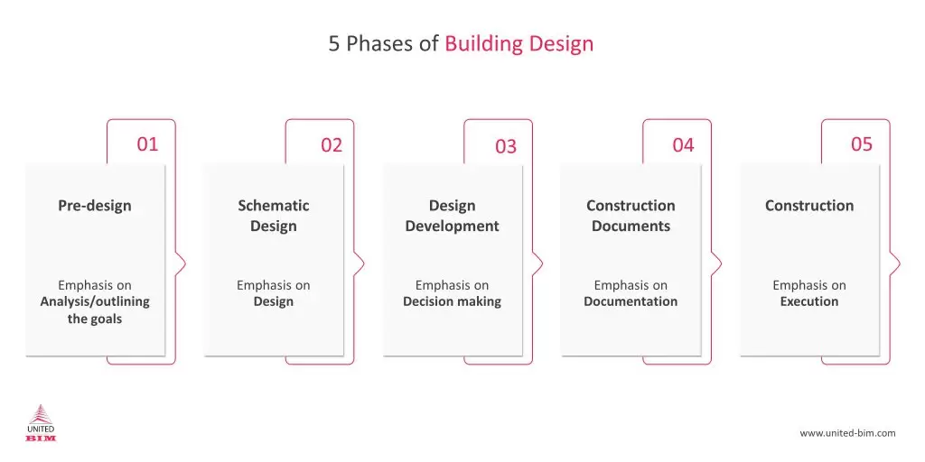 موسسه معماران آمریکا ، پیتزبورگ در مقاله جامعه خود ، روند طراحی را به چند مرحله تقسیم کرده است. این پنج مرحله به صورت زیر است: