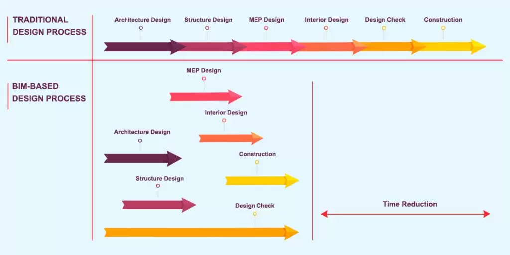 با توجه به هماهنگی MEP ، فرایند طراحی سنتی به طراحی تکمیل شده از طرف همه شرکت کنندگان در پروژه متکی است . در حالی که در رویکرد مبتنی بر BIM ، کار از اولین مرحله ی توسعه طراحی آغاز می شود.