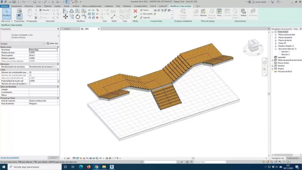 سرانجام ، هم در مورد پله ها و هم در سطح شیب دار ، Revit نرده ها را به طور خودکار  مدل می کند. همچنین می توانیم این نرده ها را کپی و اصلاح کنیم ، که در مطالب بعدی در موردش توضیح خواهیم داد.
